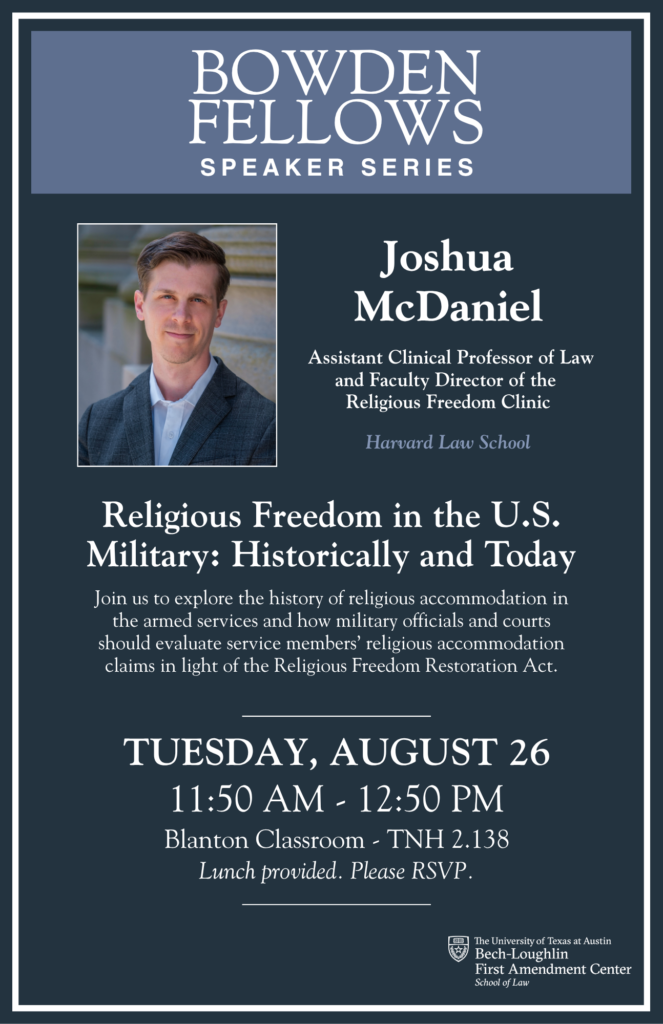 Professor Joshua McDaniel (Harvard Law School) joins us to explore the history of religious accommodation in the armed services and how military officials and courts should evaluate service members’ religious accommodation claims in light of the Religious Freedom Restoration Act.