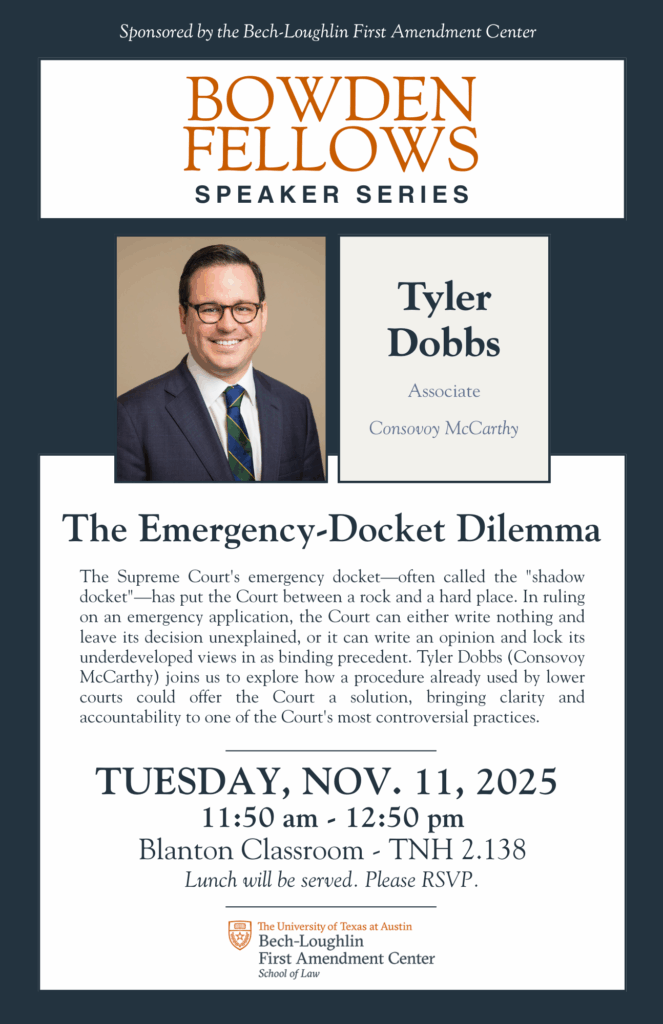 The Supreme Court’s emergency docket—often called the “shadow docket”—has put the Court between a rock and a hard place. In ruling on an emergency application, the Court can either write nothing and leave its decision unexplained, or it can write an opinion and lock its underdeveloped views in as binding precedent. Tyler Dobbs (Consovoy McCarthy) joins us to explore how a procedure already used by lower courts could offer the Court a solution, bringing clarity and accountability to one of the Court’s most controversial practices. We hope you join us!