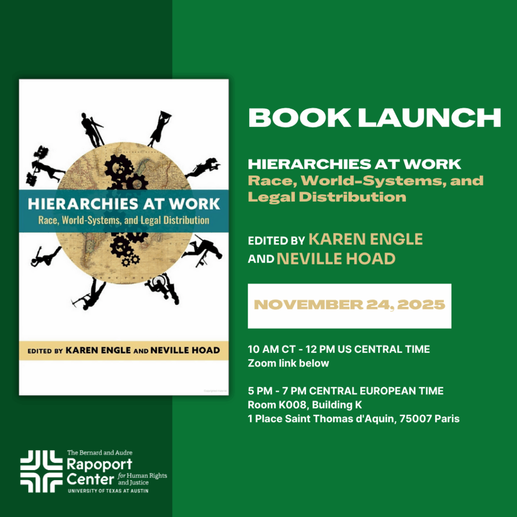 Join this live book launch for Hierarchies at Work: Race, World-Systems, and Legal Distribution (Columbia University Press, 2025), featuring four of its contributors. The anthology, edited by Rapoport Center co-directors Karen Engle and Neville Hoad, challenges dominant understandings of both economic inequality and the future of work. Drawing from longtime Rapoport Center projects on inequality and the future of work, lead scholars in law, social sciences, and the humanities consider the production and reproduction of global hierarchies by revisiting and deploying three critical approaches that emerged in the late twentieth century: racial capitalism, world-systems theory, and critical legal distributional analysis. They demonstrate that these methods—especially when brought together—offer new insights into the forces that entrench the asymmetries of power and wealth that are too often shorthanded as inequality. They also uncover elisions and erasures of the past and present in prevailing technological-determinist narratives about the future of work.