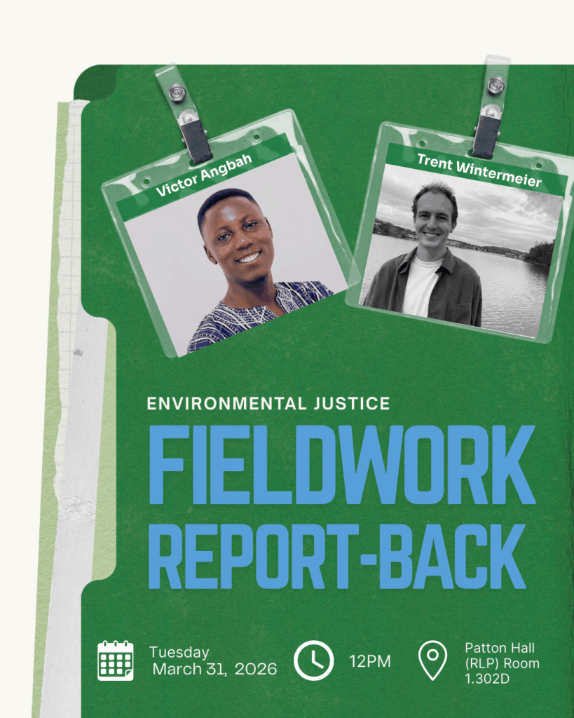 Victor Angbah will present “Disease Ecology in the Pra River Basin of Ghana,” examining links between environmental conditions and public health. Trent Wintermeier will present “Extractive Partnerships: Reciprocity and Resistance Along the Prince Rupert Gas Transmission Pipeline,” focusing on relationships between Indigenous communities and extractive development.