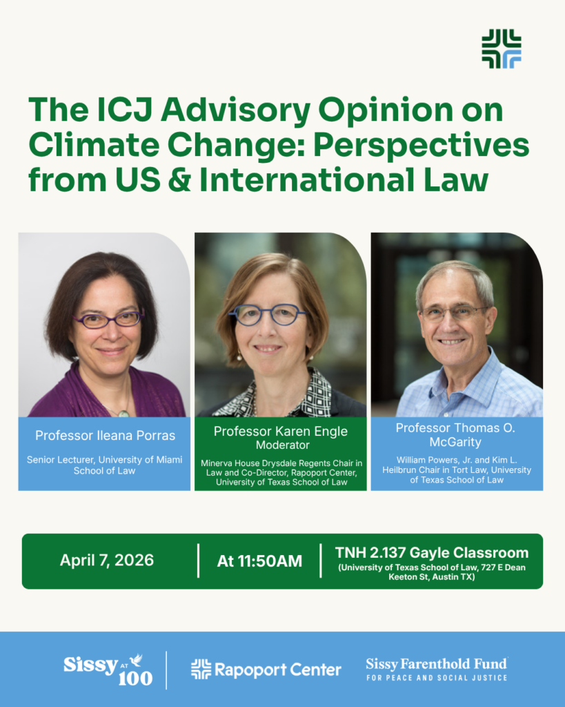 On July 23, 2025, the International Court of Justice (ICJ) issued a unanimous landmark advisory opinion on the “Obligations of States in Respect of Climate Change”—an explicit elaboration of states’ responsibilities under international law to mitigate, adapt to, and repair the effects of the climate crisis. Join the Rapoport Center for Human Rights and Justice and the Sissy Farenthold Fund for Peace and Social Justice for a discussion of this opinion with Professor Ileana Porras (University of Miami School of Law) and Professor Thomas O. McGarity (University of Texas School of Law).